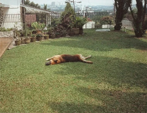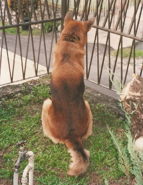 ... that far corner of the garden overlooked the road, and something – we never did work out what it was – had caught Prince’s attention. I decided to sneak up to take a picture because I liked the way he looked from the back. My dad kept saying it would never work; Prince would realise I was there and turn before I took the picture. I got right up behind him and took the picture; he did not turn around once, or even flick his ears back. Not even when I walked back with a smug grin. My dad was not impressed – kept sighing and saying, in a highly dramatic fashion, what a waste of money it had been, all that training as a guard dog, called the poor unsuspecting dog a useless so-and-so … I remember my mum laughing so much …