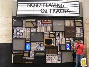 I really like this - a wall of 'sound' - speakers, cassettes, record albums, video tapes. The blue screen parts (next to the guy) are actual music centres, you can plug in your headphones and listen to music!