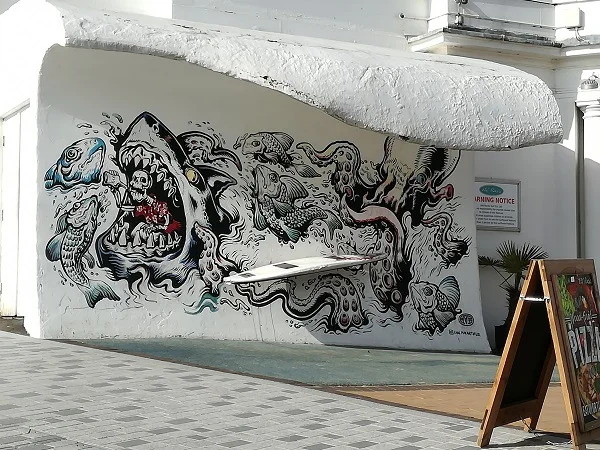 The last 2 pictures are of graffiti in town – the first one heading down to the gardens; the other is part of a restaurant by the beach, first time I’ve noticed it!